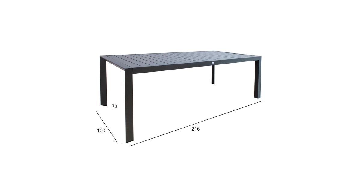Pöytä TOMSON 216x100xH73cm, tummanharmaa. Pöytä on valmistettu alumiinista ja viimeistelty tummanharmaalla jauhemaalilla. Tuote kestää hyvin vaihtelevia sääolosuhteita ja on helppo huoltaa. SÄILYTYS: kesäkauden päätyttyä suosittelemme puutarhakalusteiden säilyttämistä sisätiloissa. Puhdista ja kuivaa huonekalut ennen varastointia. Käytä säilytykseen kuivaa, hyvin ilmastoitua tilaa.