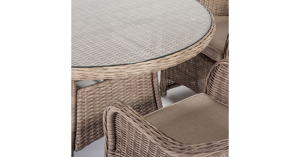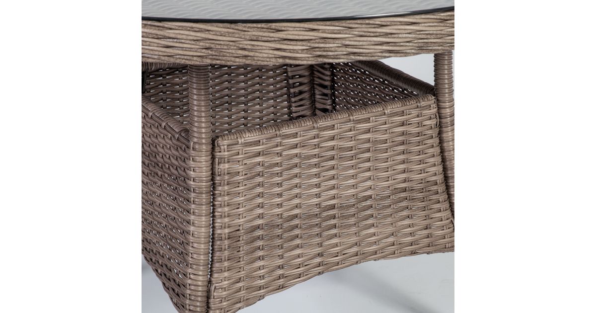 Pöytä TOSCANA D110xH73cm, beige. Pöytälevy: 5 mm karkaistu kirkas lasi. Pulverimaalattu alumiinirunko on päällystetty muovipunolla. Tuote on kestävä vaihtuvissa sääolosuhteissa ja helppo huoltaa. Ulkokalusteiden käyttöiän pidentämiseksi suosittelemme ulkokalusteiden päällisten käyttöä. SÄILYTYS: Kesäkauden päätyttyä suosittelemme puutarhakalusteiden säilyttämistä sisätiloissa. Puhdista ja kuivaa huonekalut ennen varastointia. Käytä säilytykseen kuivaa, hyvin ilmastoitua tilaa.