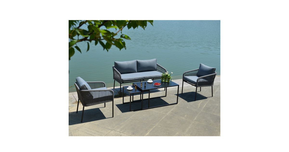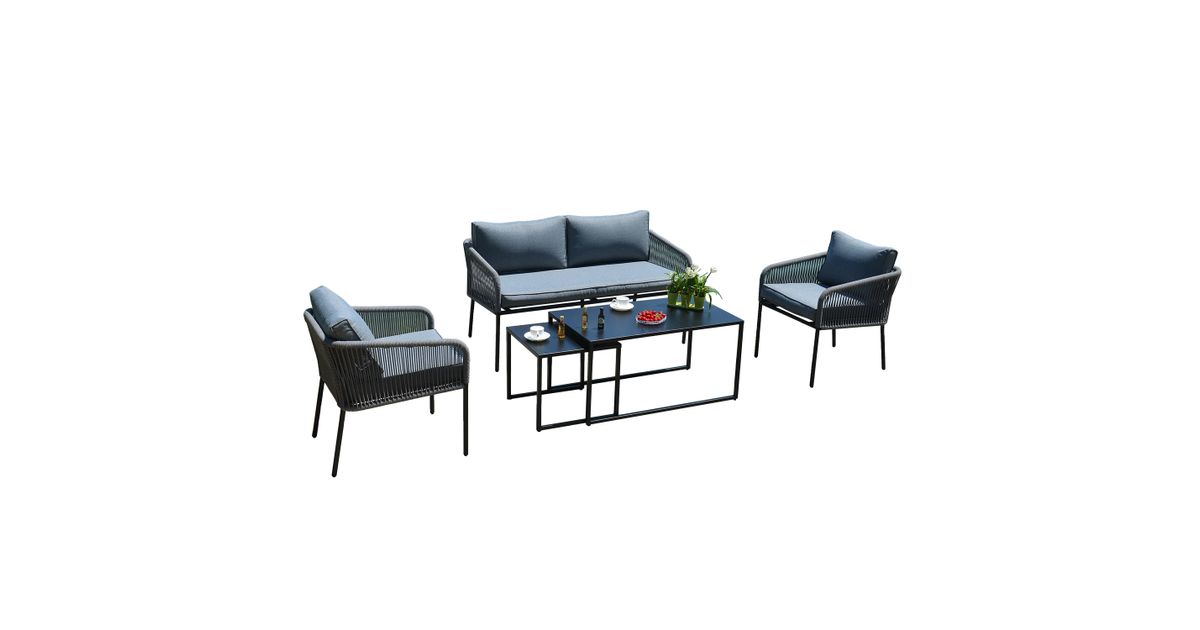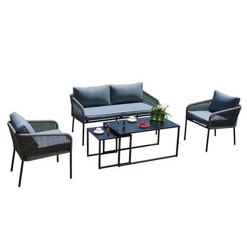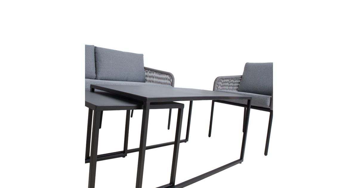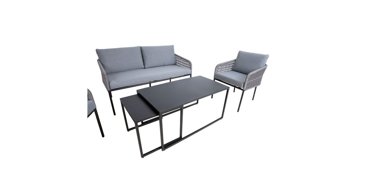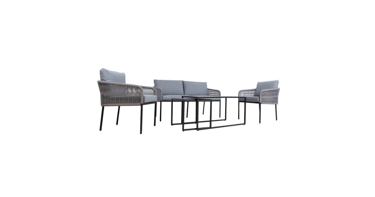Puutarharyhmä LEVINE 2 pöytää, sohva ja 2 nojatuolia, harmaa. Setti sisältää 2 sohvapöytää, jotka voidaan asettaa päällekkäin tai erikseen tarpeen mukaan. Sohvan, tuolien ja pöytien päärakenne on terästä, pöytälevyt 1mm peltiä. Kaikki metalliosat on viimeistelty harmaalla pulverimaalilla. Sohvan ja tuolien selkänoja ja käsinojat on peitetty narupunoksella. Pehmeät harmaat tyynyt takaavat istumamukavuuden. Tyynynpäälliset on valmistettu harmaasta polyesterikankaasta. Setti sisältää 2 tuolityynyä 55x60x8cm, 2 selkätyynyä 54x48x8cm, sohvatyynyn 135x60x8cm ja 2 selkätyynyä 68x40x8cm. Vetoketjulliset tyynynpäälliset ovat irrotettavia ja pestäviä. Pöytien mitat ovat 49x49xH45cm, 100x55xH50cm. Sohvan mitat ovat 142x69,5xH70,5cm. Nojatuolin mitat 60x69,5xH70,5cm. Istuimen korkeus rungon reunaan on 41cm, tyynyn kanssa 49cm. Tuote on kestävä ja erittäin helppohoitoinen vaihtuvissa sääolosuhteissa, vain tyynyt tarvitsevat suojaa sääolosuhteilta. Ulkokalusteiden käyttöiän pidentämiseksi suosittelemme ulkokalusteiden päällisten käyttöä. SÄILYTYS: kesäkauden päätyttyä suosittelemme puutarhakalusteiden säilyttämistä sisätiloissa. Puhdista ja kuivaa huonekalut ennen varastointia. Käytä säilytykseen kuivaa, hyvin ilmastoitua tilaa.