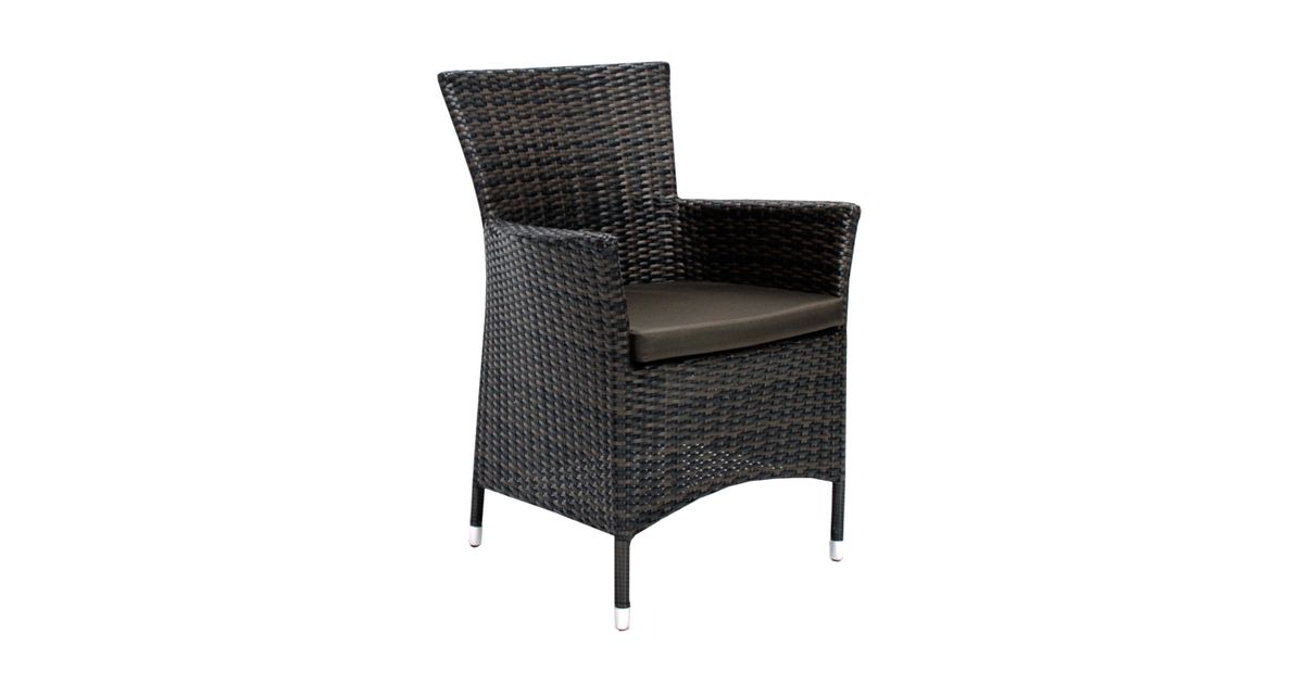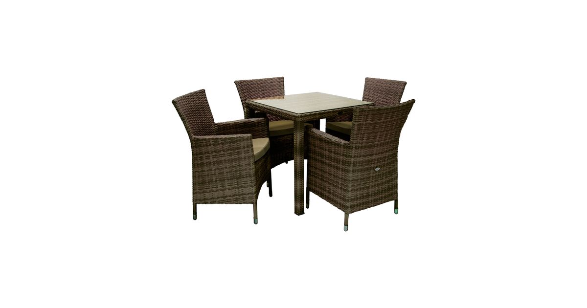 Puutarharyhmä WICKER pöytä ja 4 tuolia, tummanruskea. Pöydän mitat ovat 73x73xH71cm. Pöytälevy: 5 mm karkaistu kirkas lasi. Pulverimaalattu alumiinirunko on päällystetty muovipunolla. Tuolin vahva ja vakaa teräsrunko on päällystetty muovi punoksella. Mukana istuintyyny. Tyynyn mitat 46x47x4,5cm. Tyynyn päällinen on valmistettu polyesterikankaasta. Tuolin kokonaismitat ovat 61x58xH86cm. Istuimen leveys 46cm, istuinsyvyys 47cm, istuinkorkeus 48cm. Käsinojan korkeus maasta 62cm. Painoraja 120kg. Tuote on kestävä vaihtuvissa sääolosuhteissa ja helppo huoltaa. Ulkokalusteiden käyttöiän pidentämiseksi suosittelemme ulkokalusteiden päällisten käyttöä. SÄILYTYS: Kesäkauden päätyttyä suosittelemme puutarhakalusteiden säilyttämistä sisätiloissa. Puhdista ja kuivaa huonekalut ennen varastointia. Käytä säilytykseen kuivaa, hyvin ilmastoitua tilaa.