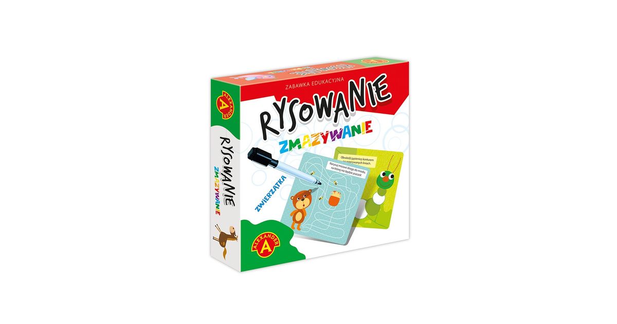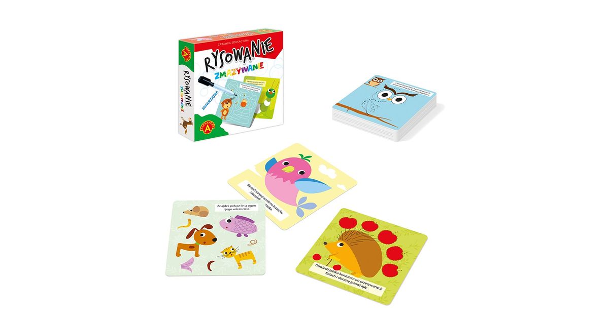 An educational toy dedicated to children preparing to learn writing. Drawing Erasing - Animals is a set of 17 double-sided boards with tasks for perceptiveness, thinking, imagination and manual dexterity exercises. The set also includes a marker, the traces of which can be easily wiped off after use, so the fun can be repeated many times. The handy size of the packaging allows you to take the toy with you literally everywhere.