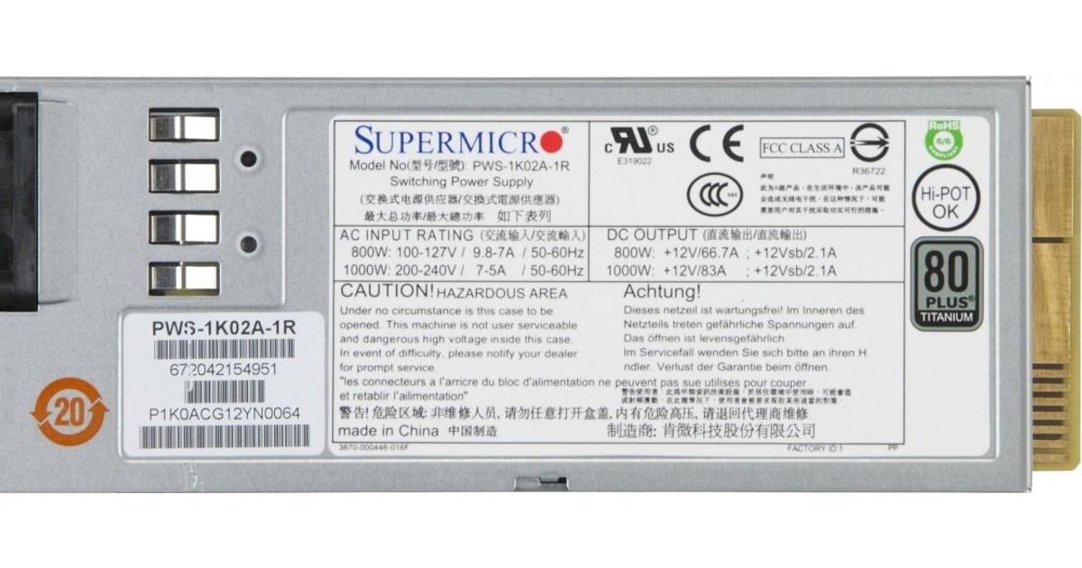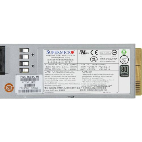 Supermicro PWS-1K02A-1R, 800 W, 100 - 240 V, 1000 W, 50 - 60 Hz, 5 - 9.8 A, Aktiivinen