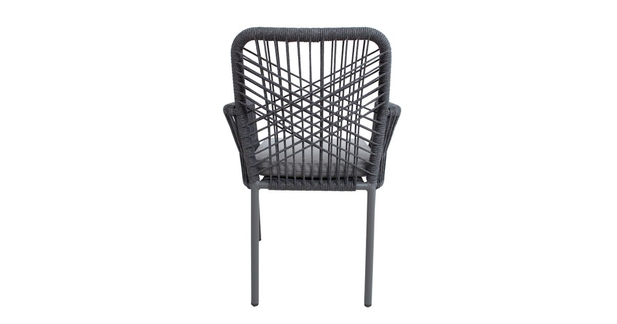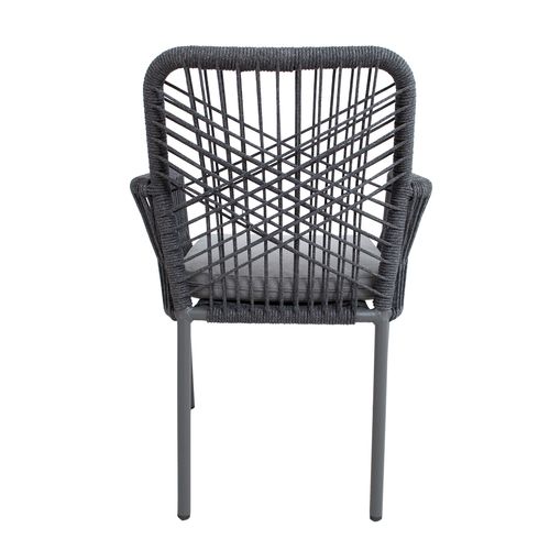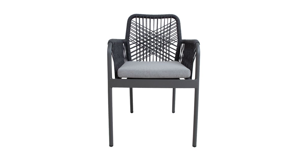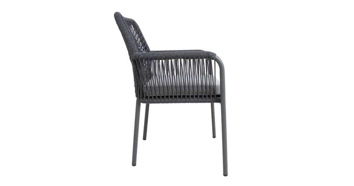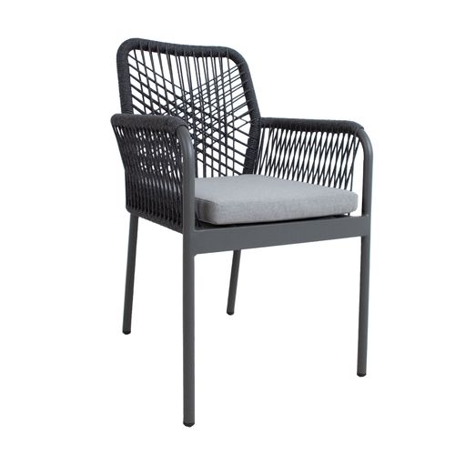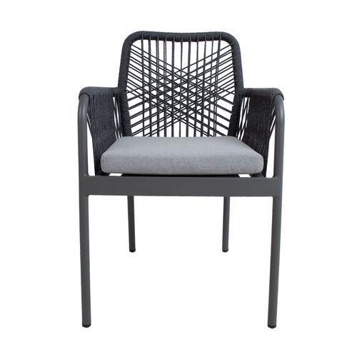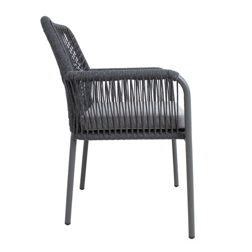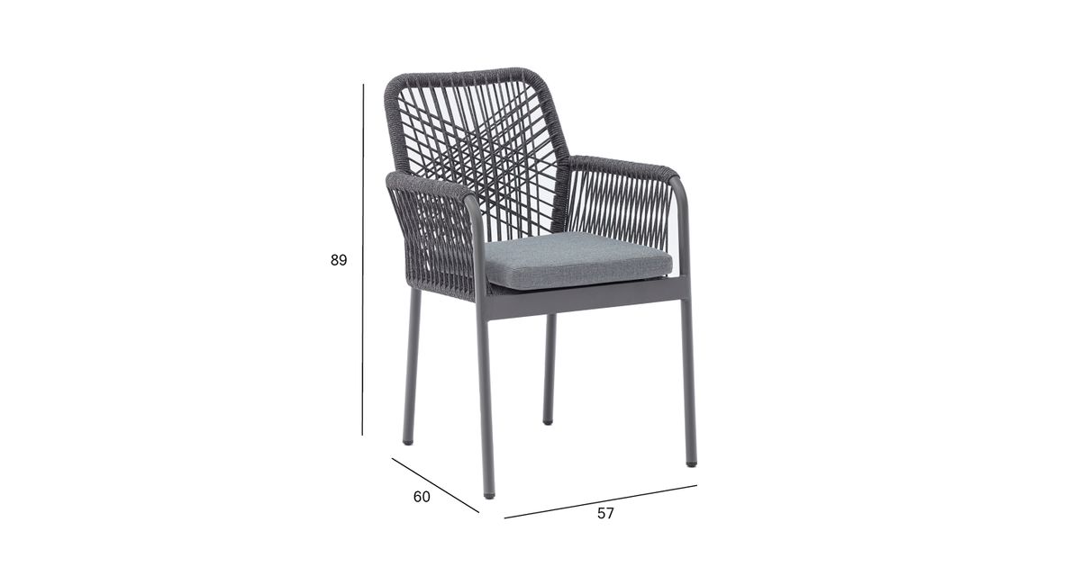 Tuoli HELA, harmaa. Tuolin runko ja jalat on valmistettu alumiinista ja viimeistelty harmaalla pulverimaalilla. Tuolin selkänoja ja käsinojat on päällystetty olefin köysipunoksella. Istuintyynyt mukana. Istuintyynyn paksuus 5cm, päällisen materiaali on polyesterikangas. Istuimen pohja on tuettu alumiinisäleillä. Tuolin mitat ovat 57x60xH89cm, istuinkorkeus 44cm. Painoraja 100kg. Tuolit ovat pinottavia ja helppo säilyttää ja säästävät tilaa, kun ne eivät ole käytössä. SÄILYTYS: Kesäkauden päätyttyä suosittelemme puutarhakalusteiden säilyttämistä sisätiloissa. Puhdista ja kuivaa huonekalut ennen varastointia. Käytä säilytykseen kuivaa, hyvin ilmastoitua tilaa.
