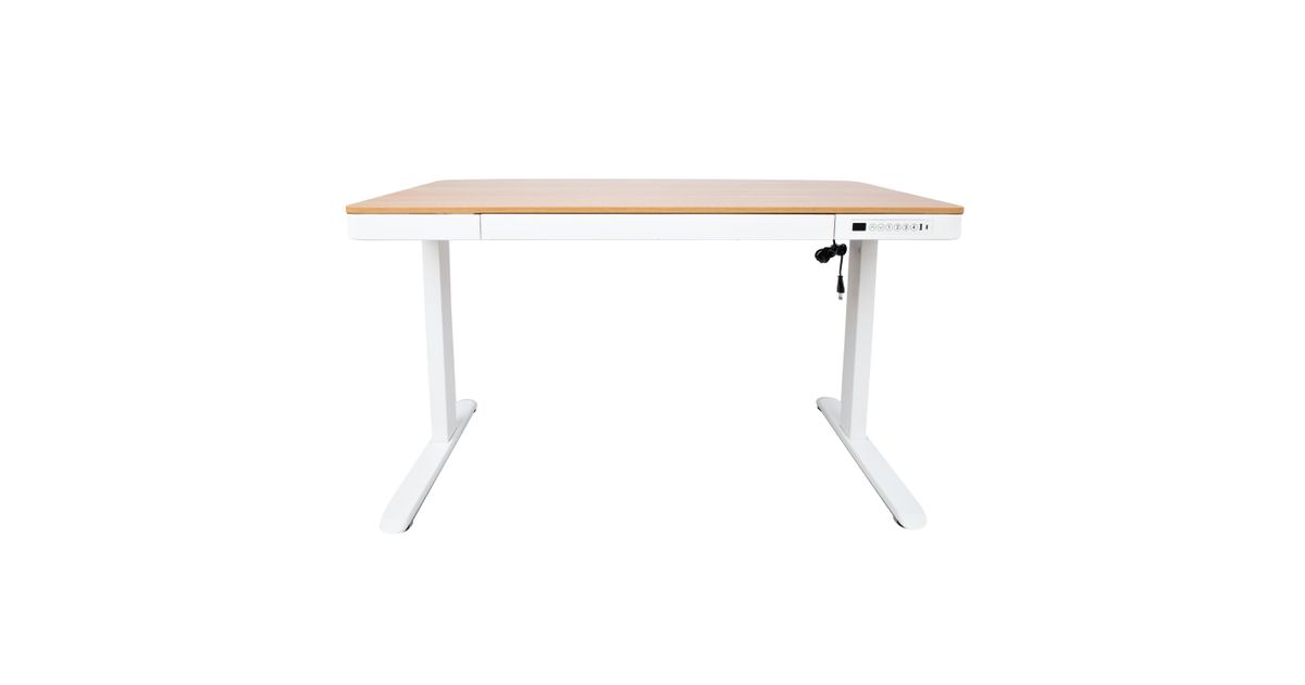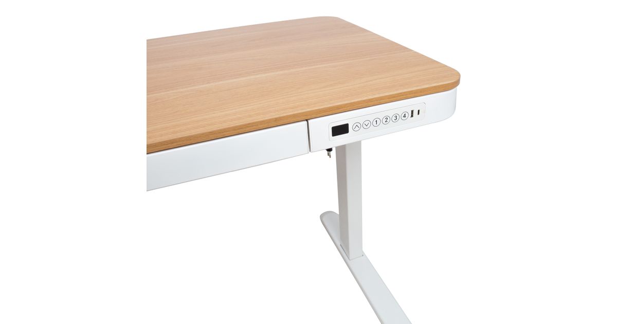 Työpöytä ERGO sähkösäädettävä, 1-moottorilla 120x60xH72-121cm, valkoinen/tammi. Korkeussäädettävä työpöytä on fiksu valinta koko perheelle! Tee omasta tai lastesi työympäristöstä mukava ja pysy terveenä! Yksi sähkömoottori ja kaksivaiheinen nostojärjestelmä takaavat nopean, tasaisen ja hiljaisen (<50dB) liikkeen. Suurin nostonopeus 25mm/s. Pöydän korkeutta voidaan säätää välillä 72-121cm. Ohjauspaneelin esiasetettuun muistiin on tallennettu 4 paikkaa. Maksimikantavuus täydellä nopeudella 50kg. Tulojännite: 100V-240V. Pöydässä on törmäyksenestojärjestelmä, 2 USB-latausporttia ja tilava vetolaatikko. Kaksinkertainen nelikulmainen teräsrakenne varmistaa pöydän jalan vakauden jopa korkeimmassa asennossa. Metalliosat on maalattu valkoisella pulverimaalilla. Tammikoristeisen melamiinipöytälevyn mitat ovat 120x60cm. Pöytä on koottu ja pakattu niin, että sen asentaminen on helppoa ja nopeaa eikä työkaluja tarvita.