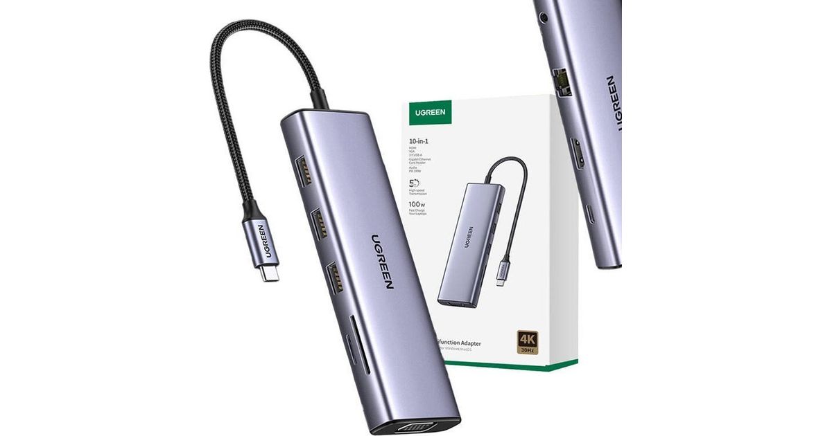 Ugreen Adapter 10in1 UGREEN CM498 Hub USB kuni 3x USB-A 3.0, HDMI, VGA, RJ45, SD/TF, AUX3.5mm, PD-muundur